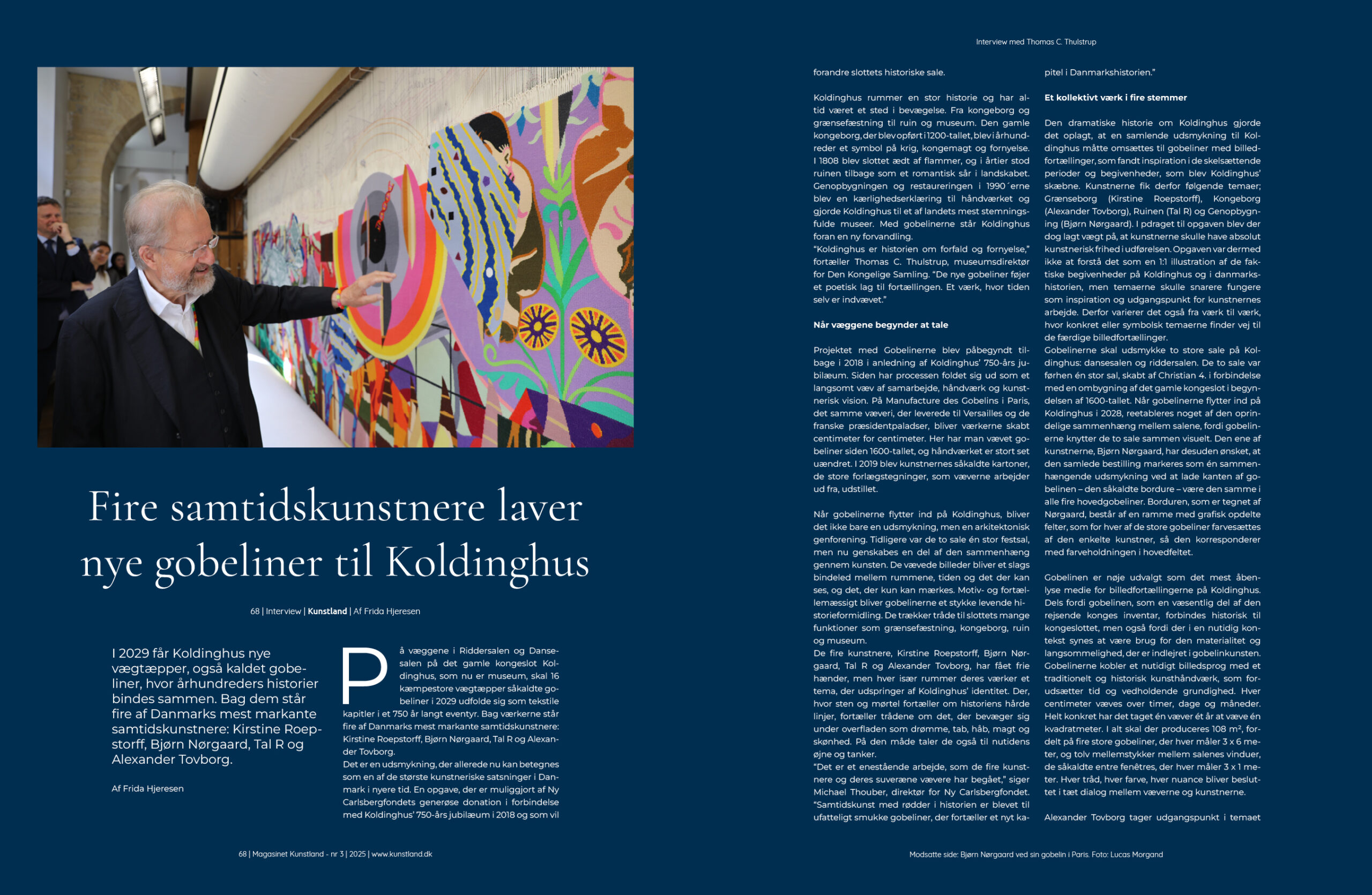 Museumsdirektør Thomas C. Thulstrup om nye gobeliner til Koldinghus, lavet af Bjørn Nørgaard, Kirstine Roepstorff, Alexander Tovborg og Tal R.